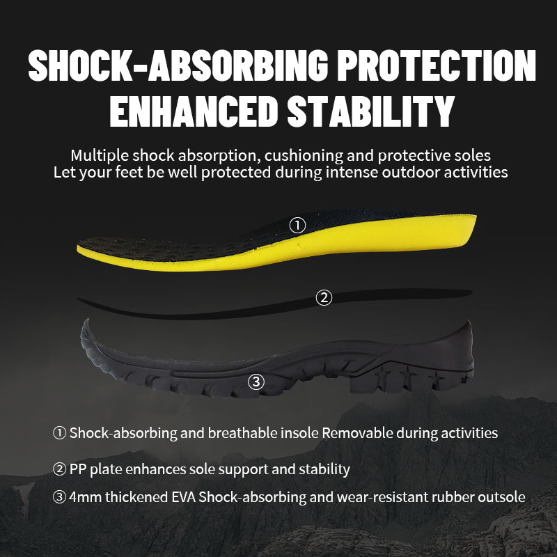 ①Жастығы бар, дем алатын ішкі табақ — оны тазалау немесе ауыстыру қажет болғанда алынуы мүмкін. ②Аяқ астындағы қосымша тірек үшін PP пластинасымен нығайтылған — сондықтан әрбір қадам берік және басқарылатын сезінеді. ③4мм қалыңдатылған EVA соққыға төзімді және тозуға төзімді резеңке сыртқы табан.