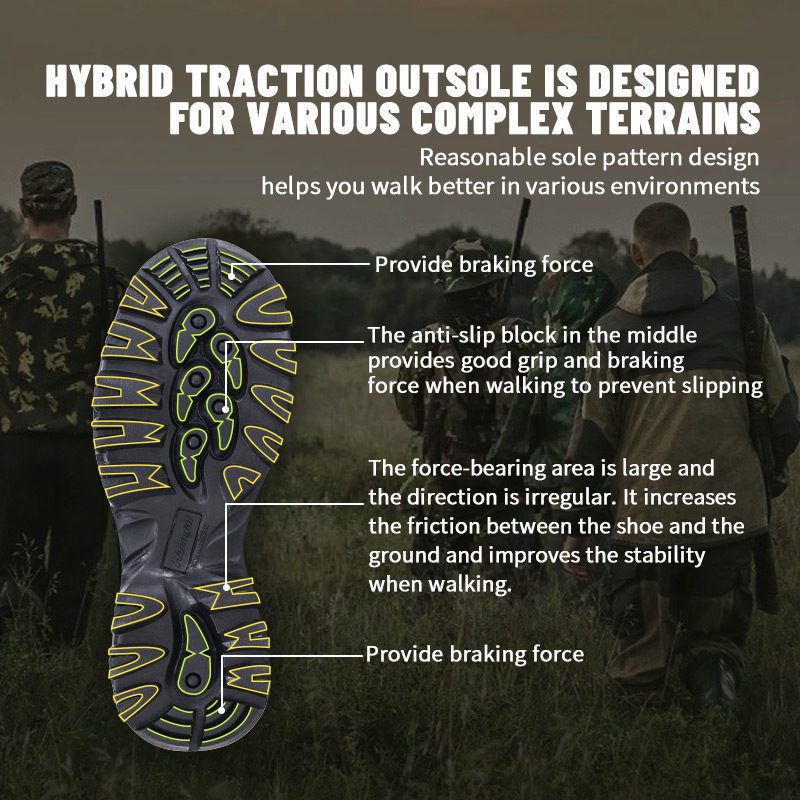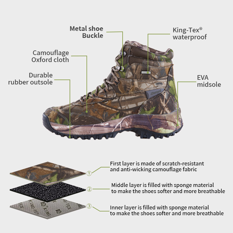 ①Poliyou жоғары созылатын ылғал өткізбейтін ішкі табан интерьерді құрғақ ұстайды. ②EVA ортаңғы табаны, камуфляж матасына оралған, жастықшасы бар және соққыны сіңіреді. ③Төзімді резеңке табаны, сырғымайды және тозуға төзімді.